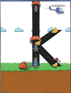 For example, when the letter k makes a diagonal stroke, the skydiver gets an unexpected kiss from a bird. That pairing increases the likelihood that students will recall the correct movement later.